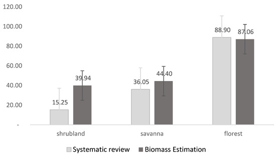 Comparison of estimated mean values and their standard deviations (bar) of aboveground biomass (Mg·ha−1) from the reviewed scientific articles and the biomass estimate using the canopy height model developed in this study.