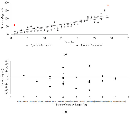 (a) Sampled plot distribution with aboveground biomass values estimated by the canopy height model (black circles) overlapping with aboveground biomass values obtained in the systematic review of scientific articles (grey circles), the red dots indicate the estimated biomass value for the two largest differences between the estimated and observed values, while the solid and dotted lines represent the mean trends for the estimated and observed biomass values, respectively. (b) Black squares represent the residual distribution between the reported and estimated aboveground biomass in Mg·ha−1.