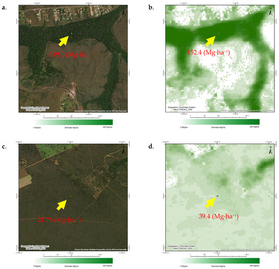 Figure 6a illustrates the Mata de Galeria fragment, with data obtained from [27], presenting average tree height values of 12.7 m with a standard deviation of 1.6 m and maximum height of 33.0 m. The fragment’s aerial biomass was estimated as 149.0 Mg·ha−1 and the standard deviation was 74.5 Mg·ha−1. The coordinate points −47.9694 and −15.9519, referring to the average canopy height (Figure 6b), present a pixel value of 24 m and a standard deviation of 6 m with an estimated aerial biomass of 152.44 Mg·ha−1. The illustration of the Typical Cerrado (Figure 6c,d), also sampled in [27] on the same area, represented the savanna fragment with average tree height values of 2.8 m, standard deviation of 1.4 m and maximum height of 10 m. The aerial biomass value was estimated as 21.7 Mg·ha−1, with a standard deviation of 11.6 Mg·ha−1. The point sampled by the average canopy height to estimate aerial biomass (Figure 6d) with coordinates −47.8461, −15.8641, resulted in a canopy height of 6 m and a standard deviation of 3 m, with aerial biomass estimated at 39.9 Mg·ha−1. The comparison with the results from the shrublands, carried out on the same farm by the authors of [5], resulted in values from the sampled fragments with an average vegetation height of 2.5 m and a deviation of 0.35 m, with a maximum height of 6 m and an estimated aerial biomass value of 17.6 Mg·ha−1. The estimation data at the coordinate point −47.9166, −15.9500 in this study were 4 m of average canopy height, with 4 m of standard deviation and aerial biomass of 27.4 Mg·ha−1.