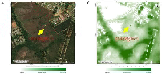 Figure 6 presents pixel values in pairs of comparisons from aboveground biomass units Mg·ha−1 within the three variations of phytophysiognomies (campo, savanna, and forest formations) in the Cerrado biome related to the experimental farm. The image pairs illustrate vegetation formations, with forests represented by Riparian Forest (Figure 6a,b), savanna represented by Typical Cerrado (Figure 6c,d), and Shrublands (Figure 6e,f). The images on the left side (Figure 6a,c,e) represent the sampled fragments from the systematic review of scientific articles. Fragments with the results of the estimated biomass values are overlaid on the images on the right side (Figure 6b,d,f). In each image, arrows with coincident points in the two images can be observed. Each point represents the values of aboveground biomass estimates, with the left side showing averages of the fragments sampled in the articles, and the right side showing the pixel of the average canopy height of the fragment and its respective estimated aboveground biomass value using the canopy height allometric model developed in this study.