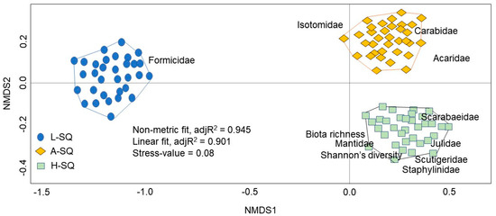 According to the NMDS analysis, the soil organism abundance was significantly dissimilar among the study sites. The ordination of the soil organisms (Formicidae, Isotomidae, Carabidae, Acaridae, Scarabaeidae, Julidae, Scutigeridae, Staphylindae, and Mantidae) and ecological indices (biota richness and Shannon’s diversity) at each studied site quality level had a stress value of 0.08. Formicidae was highly correlated with L-SQ stands, whereas Isotermidae, Carabidae, and Acaridae were highly correlated with A-SQ. Scarabaeidae, Julidae, Scutigeridae, Staphylindae, Mantidae, and ecological indices (biota richness and Shannon’s diversity) were highly correlated with H-SQ stands. Together, the soil organism abundance and ecological indices explained 91.2% of the dataset variance (Figure 2).
