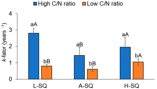 Litter decomposition (k-factor) determined by comparing decomposition rates in litter bags with different litter materials (high C:N ratio vs. low C:N ratio). Small letters compare the studied litter residues (high vs. low C:N ratio), while capital letters compare the site quality levels by the Bonferroni test at p < 0.05.