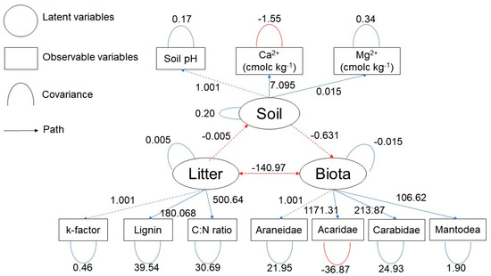 Structural equation model (SEM) indicating the effect paths of soil, litter, and biodiversity indices as influenced by low site quality level (χ2 = 152.29, p > 0.05, RMSEA = 0.027, CFI = 0.92). Soil was presented by soil pH and exchangeable Ca and Mg; litter was presented by k-factor, lignin, and C:N ratio; and biota was presented by Acaridae, Araneidae, Carabidae, and Mantodea. Arrows represent significant effects at p < 0.01 (dashed arrows) and p < 0.001 (full arrows). Blue (positive) and red (negative) values represent estimated values that indicate the proportion of response variation explained by relationships with other variables. Values associated with arrows indicate standardized path coefficients.