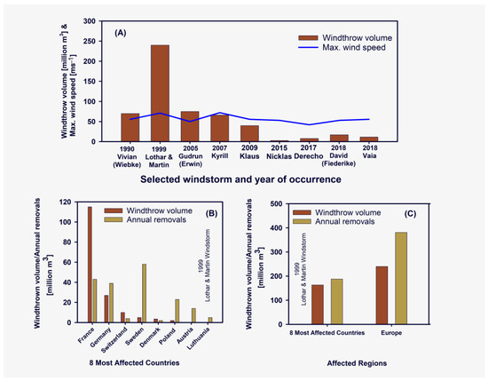 Volume of timber loss due to severe windstorms. (A): The timber loss from selected European windstorms [12,13,14,15]. (B): Comparison of the timber loss due to the 1999 Lothar and Martin windstorm with the 1998 annual timber removal in the countries most affected by the storm. (C): Comparison of the effects of the 1999 Lothar and Martin windstorm in the 8 most affected countries with the combined effect in Europe [8,16].