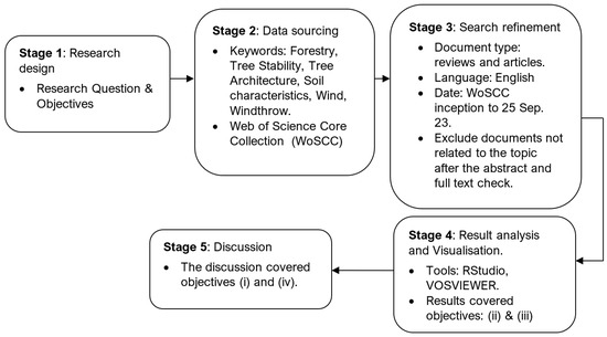 A structured literature review and bibliometric analysis were performed following the stepwise approach shown in Figure 2 as recommended by Zupic and Cater [41]. The Web of Science Core Collection (WoSCC) database was initially used to obtain articles/research papers relevant to the study. The WoSCC database was chosen due to its comprehensive coverage, meticulous indexing, and inclusion of high-quality, peer reviewed scholarly publications. It is noted that this particular database has been used successfully for other aspects of forestry research [39].