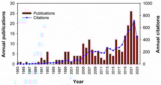 Figure 3 shows the variations in annual publications and total citations between 1983 and 2023. Whilst the number of annual publications does not appear to follow a defined pattern, it is observed that there is a gradual increase in the annual citations. A notable increase in both metrics occurred between 2019 and 2022, indicating a period of heightened research activity and impact.