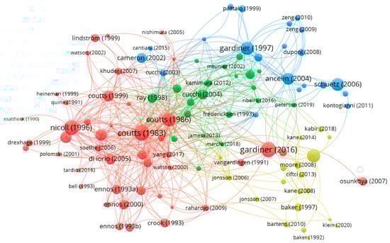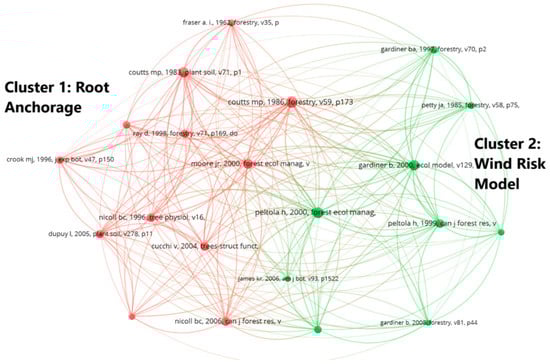 Co-citation is a bibliometric concept that refers to the occurrence of two or more publications being cited together by a third document [101]. Co-citation analysis of references is a valuable tool for understanding the structure and development of a research domain [102]. This shows the similarities between the research topics of different authors who may not be actively collaborating [103]. The nodes correspond to the strength of the co-citation connections, while the multiple lines extending from each node indicate how frequently the authors are co-cited. The co-citation analysis showed two distinct clusters (green and red) (Figure 6). The first cluster consisted of pioneering studies on tree anchorage (e.g., Coutts, [28,52], Crook and Ennos [29], and Fraser et al. [104]). To understand tree anchorage, most of these studies performed tree-pulling tests (e.g., Crook and Ennos [29] and Nicoll and Ray [51]), although a small number relate to numerical modelling (e.g., Dupuy et al. [105,106] and Fourcaud et al. [17]) to generate the empirical relationships between tree morphology, root anchorage, and tree stability. The second cluster (green) consisted of pioneering studies focused on wind risk modelling (e.g., Petty and Worrell [107], Petty and Swain [108], and Gardiner et al. [61]). While some of the studies performed wind tunnel experiments [61,107], others developed mechanistic models (e.g., GALES and HWIND) to predict tree failure using empirical data from tree-pulling experiments or climate data [109] or using a static approach [85].