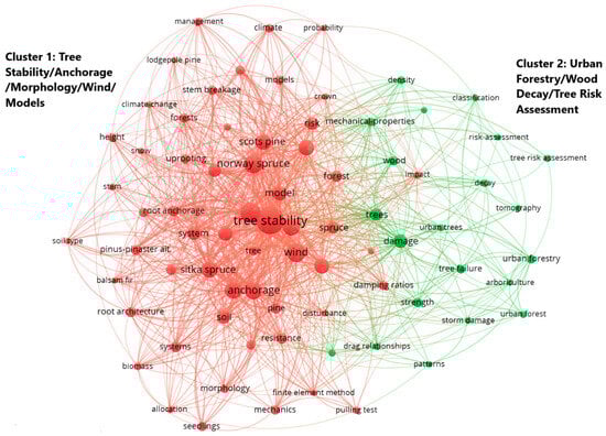 Network illustrating keyword co-occurrences between 1983 and 2023. The red lines and nodes represent the first cluster, which focuses on tree stability/anchorage/morphology/wind/models, while the green lines and nodes represent the second cluster, which focuses on urban forestry/wood decay/tree risk assessment.