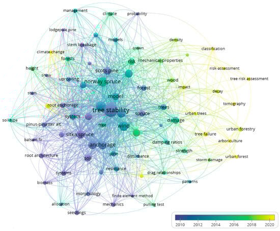 Keyword co-occurrence analysis was conducted on selected papers to identify the most used terms, facilitating the identification of key themes (Figure 7). Only keywords which occurred at least five times were included in the network. The nodes represent the keywords, and their proximity reflects their relatedness [115]. To determine the key themes, resolution of the keyword clusters was set as a minimum of 10 words per cluster in VOSviewer, and the strength of the links was normalised using the fractionalisation method [44]. Following this, two distinct clusters were identified (Figure 7). The first cluster (red) contained 57 keywords that mainly focussed on factors controlling tree stability (e.g., root anchorage, tree morphology, soil properties, and wind), tree response to wind (growth pattern), and models for predicting tree stability. The first cluster also mainly focussed on rural trees, with Sitka spruce, Norway spruce, Scot pine, Picea sitchensis, lodgepole pine, and Douglas-fir being the common tree species in this cluster. However, the second cluster (green) containing 21 keywords mainly focussed on urban forestry with sub-themes such as tree damage (decay) due to disease and tree risk assessment. The chronology overlay of the co-occurrence highlights the evolution of the keywords (Figure 8). Figure 8 shows that recently, research efforts have been focused on urban forestry and tree failure due to decay (disease) [116]. Climate change and diversity are two sub-themes driving recent studies on the stability of rural forests [117,118].