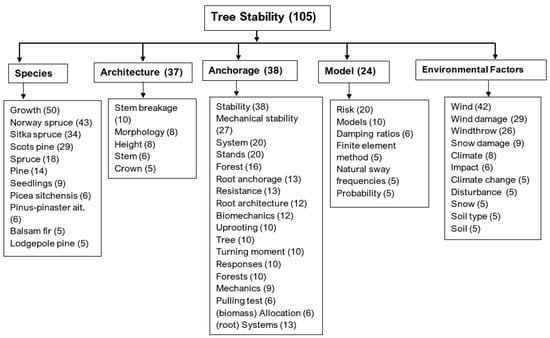 This section reviews the established knowledge gaps influencing tree stability, as highlighted in Figure 8 (Cluster 1). To provide a structured understanding of these factors, the keywords (57) within Cluster 1 were grouped into five overarching themes: tree species, architecture, anchorage, models, and environmental factors (Figure 9). All the themes also appeared as keywords except for “tree species” and “environmental factors”. Each theme encompasses a set of keywords that shed light on the diverse elements contributing to tree stability. The number of times the keywords occur is represented in brackets (Figure 9). The first theme explores the role of tree species and how their distinct characteristics impact their resilience to windthrow. The theme ‘Architecture’ discusses how elements such as tree height, diameter at breast height (DBH), crown characteristics, and spacing affect tree stability. The ‘Anchorage’ theme discusses the significance of root systems and their architecture on the stability of trees. The theme ‘Model’ focuses on the various models (i.e., numerical, mechanistic, and advanced statistical) used to predict tree stability and their applicability in various environmental contexts. Finally, the ‘Environmental Factors’ theme discusses environmental factors controlling tree stability (e.g., windstorm, climate change, and soil properties). The identified themes (species, architecture, anchorage, models, and environmental factors) were further grouped into two key sections, namely, Factors Controlling Tree Stability, which contains species, architecture, anchorage, and environmental factors, and Predicting Tree Stability, which contains numerical, mechanistic, and statistical models.