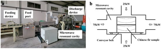 The microwave treatment was conducted using continuous feeding high-intensity microwave equipment (WXD 200 L; Sanle, Nanjing, China). This equipment operates at a frequency of 915 MHz and offers adjustable power ranging from 1 kW to 200 kW. The feeding speed can be step-less adjusted between 0.6 m/min and 6 m/min. The resonant cavity of the equipment has dimensions of 550 × 340 × 280 mm3 (length × width × height), and the microwave energy is emitted from four feed ports of the resonant cavity, with a maximum power of 25 kW at the upper and lower feed port and 75 kW at the left and right feed port (Figure 1b).