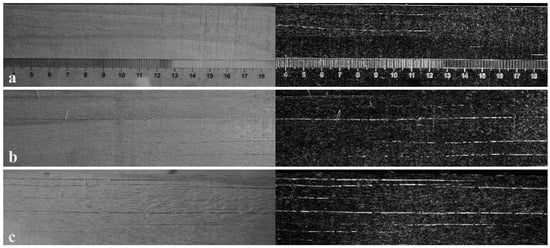 The wood samples subjected to HIMW treatment exhibit surface cracks, the number and size of which vary depending on different process parameters. To analyze these surface cracks, photographs were captured using a camera, and the original images were subsequently converted into grayscale and processed for edge detection using ImageJ software (refer to Figure 2). The edges of the cracks were identified and quantitatively measured to determine their length and width.
