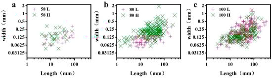 The length and width of the cracks observed were categorized into four grades, and the proportion of each grade to the total number of cracks was determined. The length of cracks was categorized into below 10 mm, 10–40 mm, 40–80 mm, and above 80 mm, and the width was categorized into below 0.1 mm, 0.1–0.2 mm, 0.2–0.4 mm, and above 0.4 mm (Table 2). The number of cracks in each grade was counted as a percentage of the total number of cracks. In the case of MWED ranging from 58 kWh/m3 to 100 kWh/m3, particularly evident in the 80 H (MWED is 80 kWh/m3 and high MC) group, there was a significant decrease in the proportion of cracks with lengths below 10 mm. Conversely, the proportion of cracks with lengths above 40 mm was substantially increased. The proportion of the grades in 10–40 mm was not significant. Furthermore, significant differences were observed in the proportion of cracks with a width below 0.2 mm, especially widths below 0.1 mm, in the 58 L (MWED is 58 kWh/m3 and low MC) group and 80 L group compared to other groups. With an increase in MWED, the proportion of cracks with widths above 0.2 mm substantially increased, indicating an increase in the number of larger cracks in the groups above 80 H group.