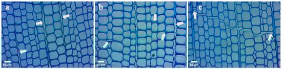 Semi-thin section images of HIMW-treated specimen. (a) TS plane of HIMW (60 L) specimen. (b) TS plane of HIMW (80 L) specimen. (c) TS plane of HIMW (100 L) specimen. The arrows in the figures indicate the location of the damage.