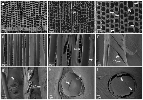 In the heartwood of Chinese fir, the bordered pit membranes are typically covered with amorphous materials, resulting in the pit membrane being completely encrusted and blocking the micropores on the pit margo. This significantly hinders permeability [27]. Additionally, the pit torus (Figure 5h) and pit margo (Figure 5i) were also ruptured and cracked due to the HIMW treatment. The HIMW treatment can also dissolve the amorphous materials on the pit margo, expose the numerous interwoven microfibrils, and increase the number and diameter of the pores. The high-pressure vapor formed within the lumen of the tracheid cell had difficulty escaping through the closed migration paths (pit aspiration). Consequently, the vapor pressure may lead to cracks in the weak region formed by closely aligned bordered pits [14,17].