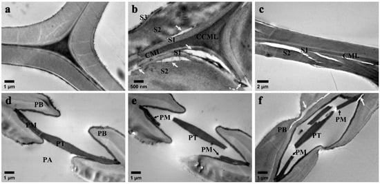TEM images of cross-sections of control and HIMW treatment specimens, taken at 80 kV. (a) Cell wall of control. (b,c) Cell wall of HIMW treatment (100 L). (d) Bordered pit (aspirated pit) of control. (e,f) Bordered pit of HIMW treatment (100 L). CCML: cell corner middle lamella between adjoining tracheids; CML: compound middle lamella (P and ML); S1: outer secondary wall; S2: middle secondary wall; S3: inner secondary wall; PT: pit torus; PM: pit margo; PB: pit border; PA: pit aperture. The arrows in the figures indicate the location of the damage.