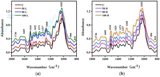 At 1736 cm−1 and 810 cm−1, the absorbance intensity of the HIMW treatment samples was higher than that of the control samples, indicating the destruction of carbonyl and acetyl groups in xylan and glucomannan. These absorption peaks correspond to the stretching vibrations of the carbonyl group (C=O) in the xylan branch chain and glucomannan in softwood [30] (Table 3). When the MWED was 60 kWh/m3 for both low and high MC samples, no notable changes in absorbance intensity were observed between the HIMW treatment and control samples. However, at MWEDs of 80 kWh/m3 and 100 kWh/m3, the absorbance intensity of the low MC hemicellulose peak showed an overall increase (Figure 7a), while the changing trend in the high MC sample was not evident (Figure 7b). This could be attributed to the negative impact of a large amount of free water on temperature rise.