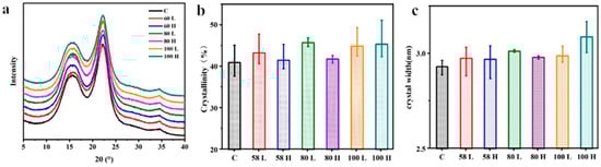 Figure 8c depicts the changes in the crystal width of cellulose in the HIMW treatment and control samples. The average D200 value of the control sample is 2.93 nm and is lower than that of the HIMW treatment samples. When the MWED is 100 kWh/m3, the average D200 values of the low and high MC samples increased to 2.99 nm and 3.09 nm, resulting in a 2.05% and 5.46% increase, respectively. This phenomenon can be attributed to hydrothermal processes that rapidly weaken the cellulose molecular chains and improve mobility [46]. The exposure of cellulose to HIMW facilitates the reorganization and recrystallization processes, enhancing the volume and degree of microfibril aggregation, ultimately increasing cellulose’s crystallinity and crystal width [47,48].