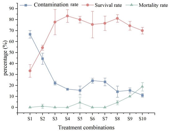 −1 of 1-naphthlcetic acid (NAA). The contamination rate, survival rate, and death rate of the explants were documented after a 15-day culture period [