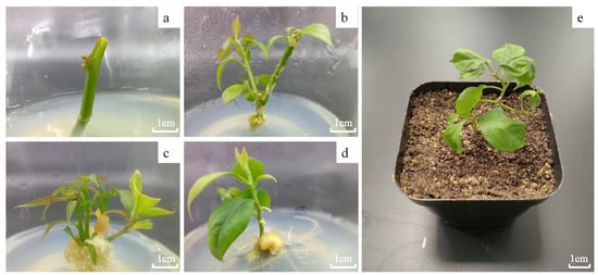 v) ratio. The survival rate of transplanting reached 82%. From a commercial perspective, the cost of producing each plant via tissue culture technology is estimated at approximately CNY 0.2, and a stem segment explant can produce approximately 300 plants within 3 months. Although the cost of single-plant-seedling cultivation is slightly higher compared with traditional hard branch cuttings, it has a large reproductive capacity, high seedling rate, good variety traits, and short time consumption. Moreover, it brings higher benefits per unit of time and is more suitable for factory production. The results of this experiment provide technical support for the application of the rapid propagation of