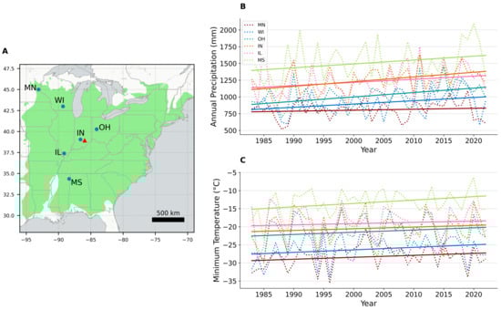 Locations of seed source origins and relevant climate information for each provenance. (A) Map of provenance locations. Solid gray lines indicate US state and Canadian provincial borders. Green shading indicates the natural range of white oak (Quercus alba, L.) [1]. Provenances are represented as labeled blue dots. The location of the common garden in southern Indiana is represented as a red triangle. (B) Annual precipitation (mm) of each provenance [26]. Solid lines represent the linear trend of each provenance with the corresponding color. (C) Annual mean absolute minimum temperatures (°C) of each provenance [26]. Again, solid lines represent the linear trend of each provenance with the corresponding color. The Indiana provenance and test location data are based on regional climate data covering both seed source locations and the common garden site.