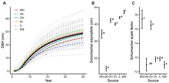 Summary of DBH growth (cm) of the six provenances planted in the southern Indiana common garden experiment (n = 81). DBH was reconstructed from increment cores and regular DBH measurements over the 40-year study period. (A) Schumacher growth model fits representing the mean DBH growth of each seed source. The solid black line represents the total population fit. (B) Connecting letters diagram (CLD) of the Schumacher asymptote parameter. Gray dots represent DBH measurement values. (C) CLD of the Schumacher scale factor parameter. For all CLDs, means not sharing any letter are significantly different at α = 0.05 according to a Holm-Bonferroni corrected post-hoc test.