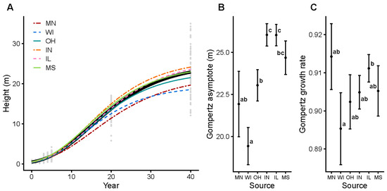 Summary of height growth (m) of the six white oak provenances planted in the southern Indiana common garden experiment based on regular height measurements over the 40-year study period (n = 81). (A) 3P Gompertz growth model fits representing the mean height growth of each provenance. The solid black line represents the total population fit. Gray dots represent height measurement values. (B) Connecting letters diagram (CLD) of the 3P Gompertz asymptote parameter. (C) CLD of the 3P Gompertz growth rate (y-scaling) parameter. For all CLDs, means not sharing any letter are significantly different at α = 0.05 according to a Holm-Bonferroni corrected post-hoc test. Note that the post-hoc test for parameter b (x-axis displacement) is not shown as there were no significant differences between provenances.
