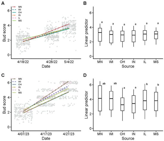 The 2023 budburst score data illustrates a departure from the previous year’s uniformity. Figure 4C and Figure 4D reveal discernible variations in the budburst scores among the provenances. The Indiana and Ohio provenances, the sources closest in latitude to the common garden site, were more conservative than the more northern and the more southern provenances. Despite a statistically significant difference in budburst progression among provenances, this difference only accounts for a four-day difference (when rounding to the nearest 24-h period) in growing season start date (Table 2).