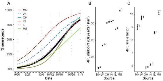 Summary of fall percent senescence, measured in fall 2022, for each of the six white oak seed sources growing in the southern Indiana common garden experiment (n = 81). Although based on the 4P logistic growth model, the start parameter was fixed at 0%, and the asymptote parameter was set at 100% for all provenances. (A) Model fits. The solid black line represents the total population fit. Gray dots represent the senescence score of individual trees. (B) Connecting letters diagram (CLD) of the 4P logistic midpoint parameter. (C) CLD of the 4P logistic scale factor parameter. For all CLDs, means not sharing any letter are significantly different at α = 0.05 according to a Holm-Bonferroni corrected post-hoc test.