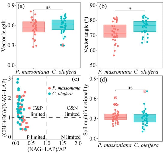 Microbial metabolic limitation and soil multifunctionality between between Camellia oleifera Abel and Pinus massoniana Lamb woodlands. (a) Vector length; (b) vector angle; (c) scatter plots of soil ecoenzymatic stoichiometry; (d) soil multifunctionality across two subtropical woodlands. (CBH + BG)/(NAG + LAP): The ratio of C-acquisition enzyme activities and N-acquisition enzyme activities. (NAG + LAP)/AP: The ratio of N-acquisition enzyme activities and P-acquisition enzyme activities. ns: non-significant difference; * p < 0.05.
