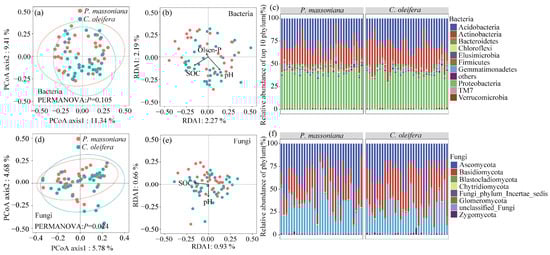 Although there was an increasing trend in the bacterial richness in C. oleifera compared to P. massoniana, only the Shannon index was significant. There was no significant difference in the alpha diversity of fungal communities between the two subtropical woodlands (Figure S5). Across the tested soils, the bacterial phylum was dominated by Proteobacteria (38.99%), Acidobacteria (30.77%), and Actinobacteria (23.11%) (Figure 3c). Within the Proteobacteria phylum, the class Alphaproteobacteria was the most abundant (25.02%) (Figure S6). Members of Ascomycota (35.03%), Basidiomycota (30.42%), and Zygomycota (1.15%) were prevalent fungal groups in both subtropical woodlands’ soils (Figure 3f). The fungal communities showed a significant difference between the two subtropical woodlands (PERMANOVA: p = 0.024), while the soil bacterial communities did not show a significant difference (PERMANOVA: p = 0.105) (Figure 3a,d).