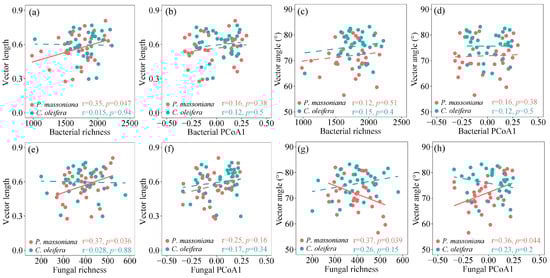Liner correlation between vector length and soil microbial parameters in two subtropical woodlands: (a) bacterial richness; (b) bacterial PCoA1; (e) fungal richness; (f) fungal PCoA1. Liner correlation between vector angle and soil microbial parameters in two subtropical woodlands: (c) bacterial richness; (d) bacterial PCoA1; (g) fungal richness; (h) fungal PCoA1. Solid and dashed lines denote statistically significant (two-sided p ≤ 0.05) and nonsignificant (two-sided p > 0.05) relationships, respectively.