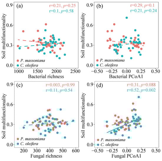 In the P. massoniana woodlands, the vector length was significantly correlated with the richness of both soil bacteria and fungi, while the vector angle showed a linearly positive correlation with the fungal community (r = 0.37, p = 0.039) and a negative correlation with the fungal richness (Figure 4). By contrast, both the vector length and vector angle had no significant correlation with any microbial parameters in the C. oleifera woodlands. Similarly, no significant relationship was observed between the vector indices and any microbial parameters in all the tested data collected from the subtropical woodlands (Figure S7). Linear correlation analysis showed that the soil multifunctionality was positively related to the fungal community in both the C. oleifera and P. massoniana woodlands (Figure 5). In contrast to the bacterial community, the soil fungal community in all the tested data showed a strong positive correlation with the potential soil multifunctionality (Figure S8).
