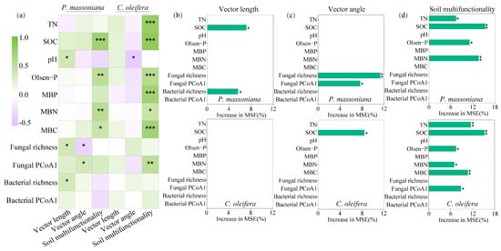 (a) Pearson correlations between soil environmental and microbial factors with vector indices and soil multifunctionality in the two subtropical woodlands. The relative importance (% of increase of the mean square error, MSE) of the environmental and microbial factors on the (b) vector length, (c) vector angle, and (d) soil multifunctionality based on random forest methods in two subtropical woodlands. TN: total nitrogen; SOC: soil organic carbon; Olsen-P: Olsen phosphorus; MBP: microbial biomass phosphorus; MBN: microbial biomass nitrogen; MBC: microbial biomass carbon; Fungal PCoA1: the first axis of PCoA for fungal community composition; Bacterial PCoA1: the first axis of PCoA for bacterial composition. * p < 0.05; ** p < 0.01; *** p < 0.001.