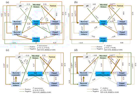 Structural equation models for the effects of environmental and microbial variables on the vector indices in the (a) P. massoniana and (b) C. oleifera woodlands and the soil multifunctionality in the (c) P. massoniana and (d) C. oleifera woodlands. Red and green arrows indicate positive and negative relationships, respectively. The thickness of the arrow is proportional to the magnitude of the standardized path coefficients and indicative of the strength of the relationship. * p < 0.05; ** p < 0.01; *** p < 0.001.