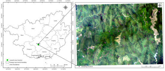 The study area is located on Gaofeng Forest Farm, Nanning City, Guangxi Zhuang Autonomous Region, China, with geographical locations ranging from 108°20′ to 108° 27′ E and 22°56′ to 23°1′ N (Figure 1). The total operating area of Gaofeng Forest Farm is over 11.63 square kilometers, with a forest volume of over 5.7 million cubic meters, making it the largest state-owned forest farm in Guangxi. The study area has a subtropical monsoon climate, with an average annual temperature of 21 °C, abundant rainfall, annual precipitation of 1200–1500 mm, average relative humidity of over 80%, and an average frost-free period of 180 days throughout the year. It includes artificial forests, mainly composed of eucalyptus and secondary forests, mainly mixed with coniferous and broad-leaved trees. The research area covers a rich variety of forest types, mainly Illicium verum, Pinus massoniana, Pinus elliottii, eucalyptus grandis, Cunninghamia lanceolata, and broad-leaved tree species. It is a typical subtropical climate forest. Moreover, its forest types, tree species, and stands are some of the most complex in the Chinese region, which provides a good representative sample of the species that grow in the country.