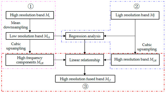 - Establish a linear relationship f between the low resolution band Mj (j = 1, …, m) to be fused and the low-frequency components Mi,L of n high-resolution bands and obtain n correlation coefficients ai (i = 1…, n):