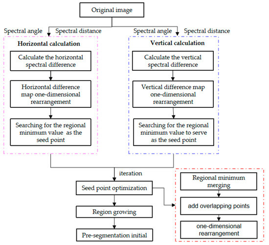 First, calculate the difference between pixel p(i, j) and its adjacent pixels horizontally to the right p (i, j + 1) or vertically to the right p (i + 1, j) in the row and column directions of the image. Add up the difference values of k bands for each pixel and calculate the square root as the difference between the pixel and its adjacent pixels. Record the difference in the spectral difference map dif_H(i,j) and dif V (i, j); next, dif_H(i, j) and dif V (i, j) are split along the row and column directions and rearranged into a 1-dimensional matrix respectively. Conduct an imHmin transformation in the 1-dimensional direction, remove shallow minima, and then search for local minima as the initial seed points. Then merge the local minima in both directions and find the common positions of the horizontal and vertical seed points on the original horizontal and vertical seed maps. Finally, conduct a 1-dimensional rearrangement of the horizontal and vertical seed point graphs with added common points; the computation flow is illustrated in Figure 5.