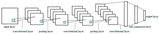 CNN usually consists of five parts: input layer, convolutional layer, pooling layer, fully connected layer, and output layer. The basic network structure is shown in Figure 6. The input layer is a matrix of M × N × C, where M and N represent the length and width of the matrix, and C represents the number of channels for the input matrix. Each convolutional layer contains several convolution kernels; the size and movement step of each kernel can be adjusted as needed, but the depth must align with the number of channels in the input layer. Typically, the number of convolutional kernels increases as the network depth deepens with the aim of progressively extracting deep features of image objects. The pooling layer is typically positioned after the convolutional layer via two primary methods: average pooling and maximum pooling. The purpose is to reduce feature dimensionality, condense data and parameter counts, minimize overfitting, and enhance the model’s fault tolerance. The fully connected layer plays the role of a classifier within the neural network, integrating highly abstracted features from multiple convolutions and mapping the learned ‘distributed feature representations’ to the sample label space. The structure and operation of the output layer are consistent with those of traditional feedforward neural networks, using logic functions or normalized exponential functions to output classification labels.