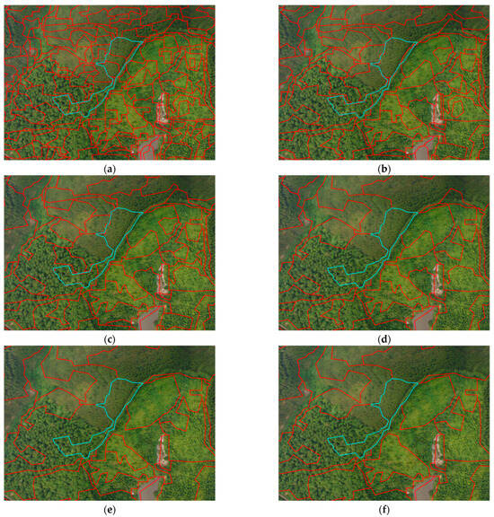 Segmentation results at different scales: (a) segmentation scale: 20; (b) segmentation scale: 30; (c) segmentation scale: 40; (d) segmentation scale: 50; (e) segmentation scale: 60; (f) segmentation scale: 70.