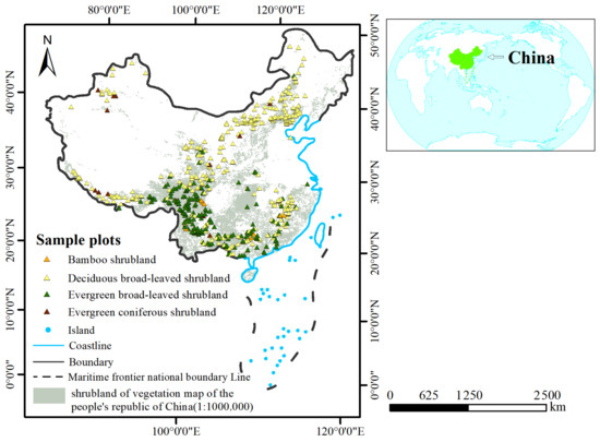 To quantify the structural characteristics and diversity of shrubland vegetation from across China’s shrublands, we collected data from 751 sites as part of the China Science and Technology Basic Work Program (2015FY110300) supported by the Ministry of Science and Technology of the People’s Republic of China. Our criteria for selecting sample sites were as follows: firstly, to exclude disturbed or damaged shrublands, particularly those in the recovery stage; secondly, to avoid selecting shrubland in ecological transition zones adjacent to forests or grasslands; and finally, in mountainous environments, shrubland occurring at higher elevations was chosen as sample sites. In these areas, factors such as altitude and climate prevent the growth of forests, making shrubland the dominant vegetation type. The shrubland sample sites ranged from 75.5° to 132.8° E longitude and 18.6° to 52.4° N latitude, with altitudes ranging from 0 to 5300 m a.s.l (Figure 1). The shrubland data included four shrubland types that are the most widely distributed in China: bamboo shrubland; evergreen broad-leaved shrubland; deciduous broad-leaved shrubland; and evergreen coniferous shrubland. We sampled these plots during June to September, 2015–2020.