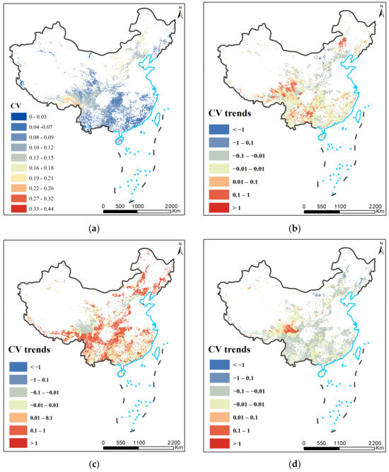 (a) CV of shrubland NPP during 2001–2022; (b) difference in CV between 2006 and 2010 compared to 2001–2005. (c) Difference in CV between 2011 and 2015 compared to 2006–2010; (d) difference in CV between 2016 and 2022 compared to 2011–2015.