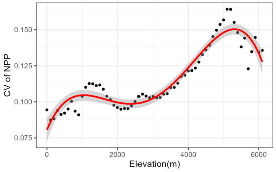 Elevational pattern of cv of NPP in China. The red line indicates the best fit model of polynomial. The gray areas represent 95% confidence intervals and the black dots are the mean values of the CVs.
