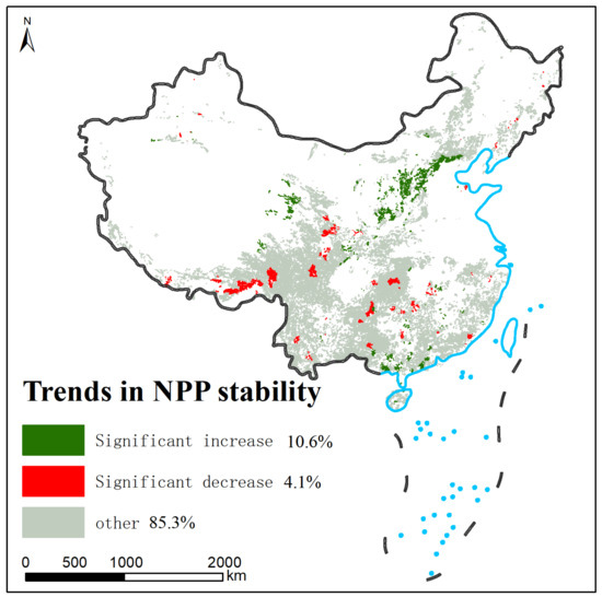 In order to analyze the trend of shrubland stability, we divided the years 2001–2022 into five time segments: 2001–2005, 2006–2010, 2011–2015, and 2016–2022. Then, we compared the difference in the CV of NPP for each time segment with that of the last, respectively. A larger CV value represents a decrease in stability for this time period relative to the previous time period, and vice versa for an increase in stability.