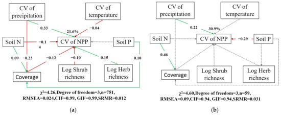 Cascading relationships of annual NPP coefficients of variation with environmental variables and community characteristics. (a) Sample sites with significant increases in NPP stability on the time series; (b) all sample sites. Gray dotted lines indicate insignificant pathways from a priori models. Green and red arrows indicate positive and negative flows of causality (p < 0.05), respectively. Numbers on the arrow indicate significant standardized path coefficients. CV: coefficient of variation; Soil N: soil nitrogen; Soil P: soil phosphorous; Coverage: total shrubland canopy cover; Log Shrub richness: Log-transformed number of shrub species; Log Herb richness: Log-transformed number of herb species.