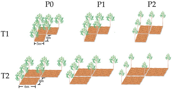 In 2018, the experimental plantation of P. tomentosa ‘Jiangan No.1’ was established at a density of 1666 trees ha−1 (1.5 m × 4 m). In the spring of 2022, a randomized block design was employed in a 2 × 3 factorial scheme with two thinning intensities (833 trees per hectare, T1, and 416 trees per hectare, T2) and three pruning heights (no pruning, P0; 3 m pruning from ground, P1; and 4 m pruning from ground, P2) across three 60 × 40 m blocks (blocks I, II, and III). Six combined treatments were implemented: 3 × 4 m—no pruning (T1P0), 3 × 4 m—3 m pruning (T1P1), 3 × 4 m—4 m pruning (T1P2), 6 × 4 m—no pruning (T2P0), 6 × 4 m—3 m pruning (T2P1), 6 × 4 m—4 m pruning (T2P2) (Figure 2). Each treatment had three replicates, each with a randomized plot measuring 20 m × 20 m, resulting in 18 plots.