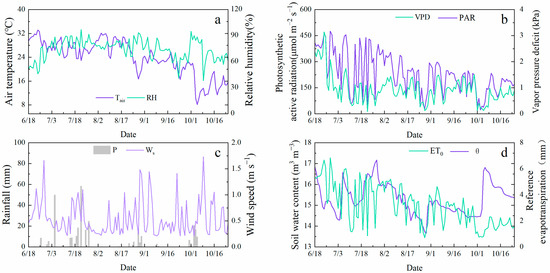 Seasonal variations in daily mean values of air temperature ((a), Tair), relative humidity ((a), RH), photosynthetic active radiation ((b), PAR), vapor pressure deficit ((b), VPD), daily total rainfall ((c), P), wind speed at 2 m height ((c), Ws), soil water content ((d), θ) at the depths of 20 cm soil layer, and reference evapotranspiration ((d), ET0) in 2022 main growing season.