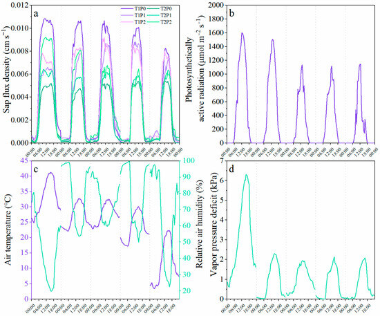 Diurnal course of sap flow density (Jm) of different treatments (a) for five selected sunny days (24 June, 29 July, 17 August, 2 September, and 11 October) and the corresponding daily photosynthetically active radiation (PAR) (b), air temperature (Tair), relative air humidity (RH) (c), and vapor pressure deficit (VPD) (d).