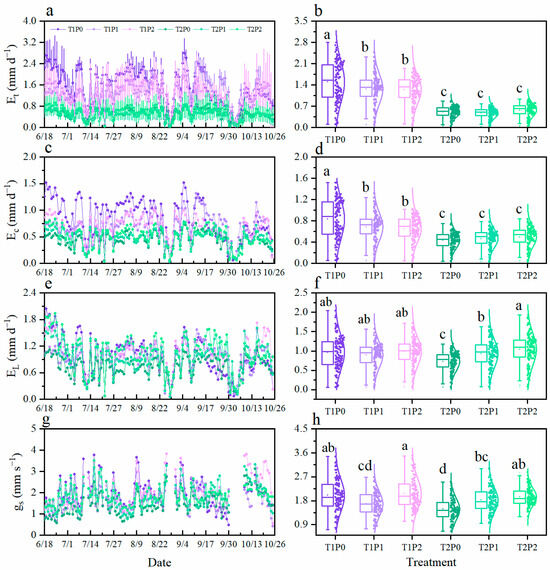 Seasonal dynamics of individual transpiration (Et), stand transpiration (Ec), transpiration per unit leaf area (EL), and canopy conductance (gc) under different treatments (a,c,e,g). Box plots indicate the range of distributions, and the data points represent sample sizes of the treatments, which were fitted with normal curves (b,d,f,h). Different letters represent significantly different means between treatments (p < 0.05).