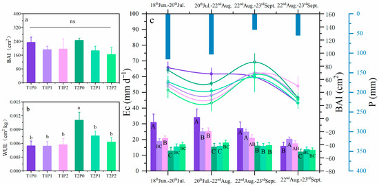 During the study period, stand WUE was significantly higher (p > 0.05) in the T2P0 treatment compared to the other treatments (Figure 8b). However, BAI showed no significant differences (p > 0.05) among all treatments (Figure 8a) but differed in different rainfall periods (Table 5). The total rainfall from 18 June to 22 August (wet summer) was 218.44 mm (Figure 8c). During this period, BAI was positively correlated with Ec for T1P0, T2P1, and T2P2 and negatively correlated with Ec for T1P1, T1P2, and T2P0 (Figure 9a). Additionally, WUE was significantly higher for T2P0 than the other treatments (p < 0.05) (Figure 9c). BAI showed a significant difference among treatments (p < 0.05), with T2P0 and T1P0 each having significantly higher BAI than other treatments (p < 0.05) (Figure 8c; Table 5). In terms of transpiration, Ec was significantly higher in T1P0 than in the other treatments (p < 0.05), while it was significantly lower (p < 0.05) in T2P0 than in T1P0 (Figure 8c).